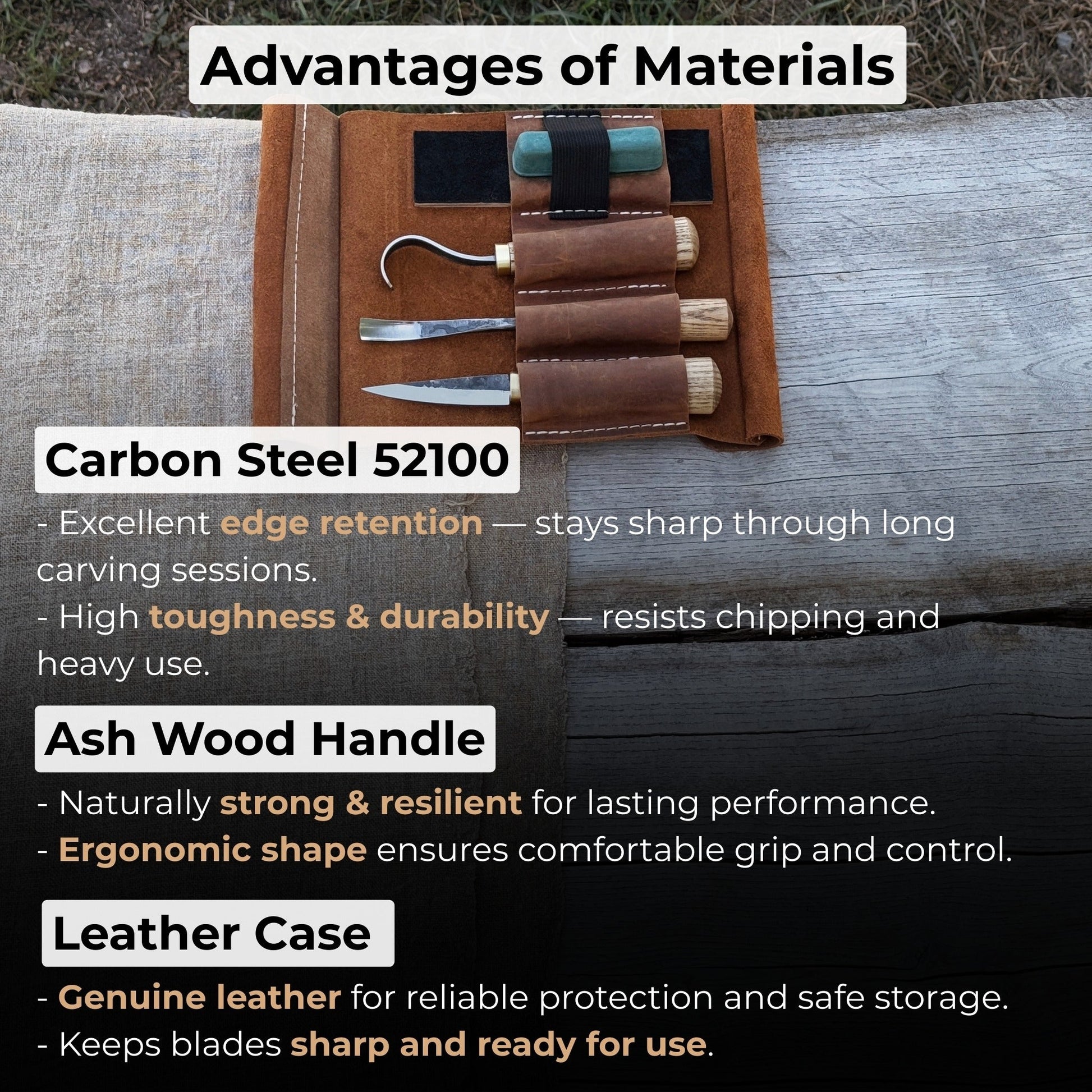 A custom leather case keeps the complete set protected, organized, and travel-ready—ideal for carving on the go.