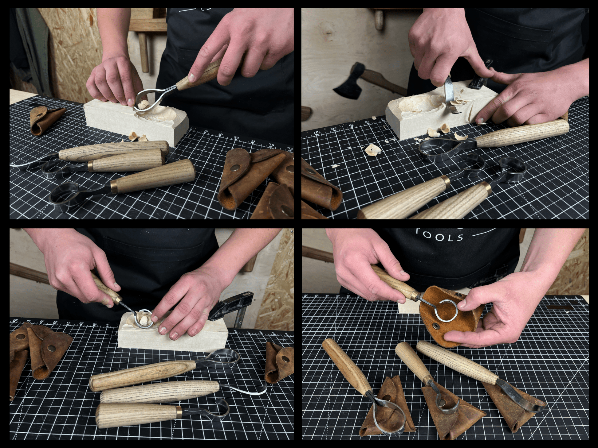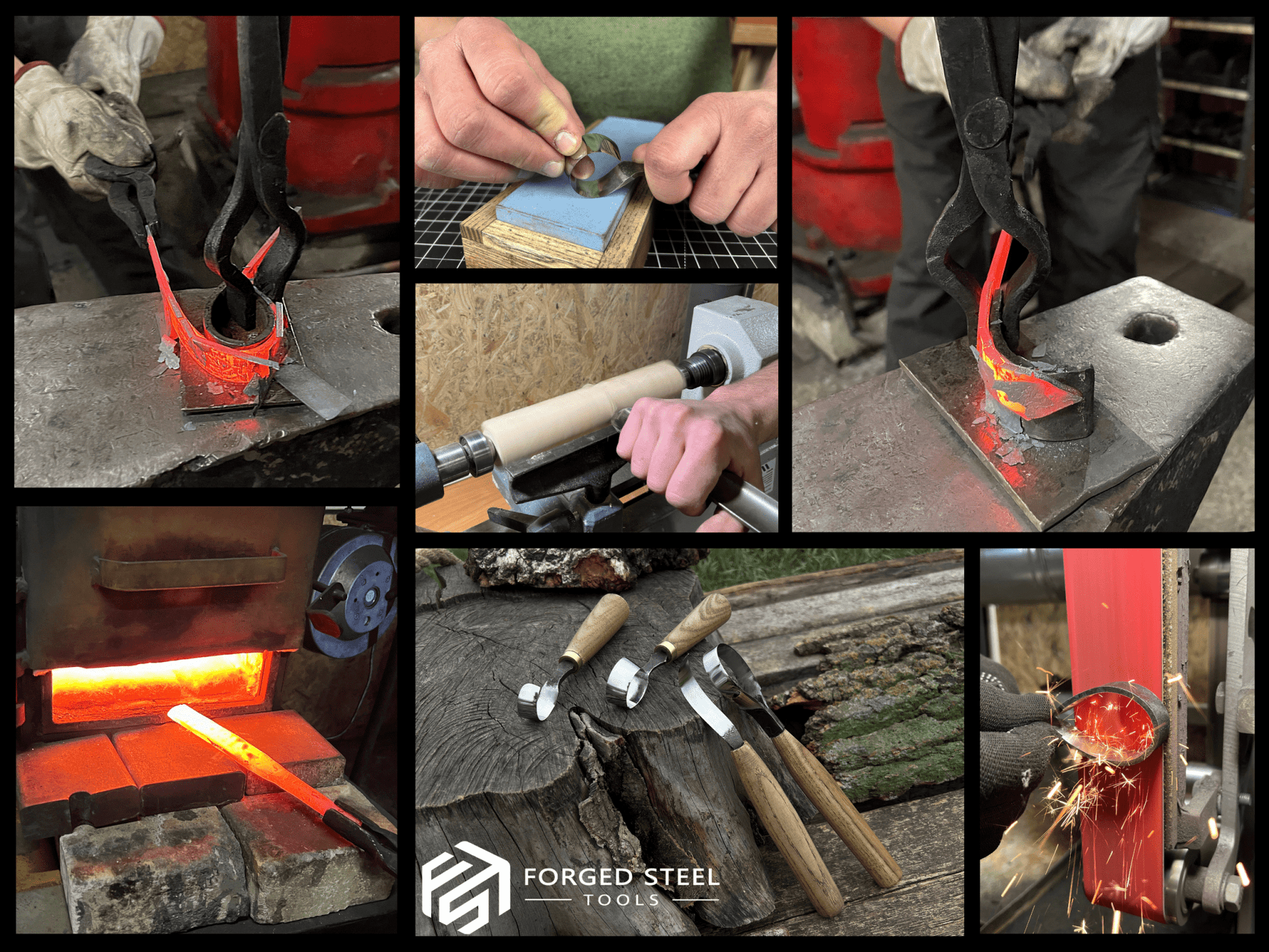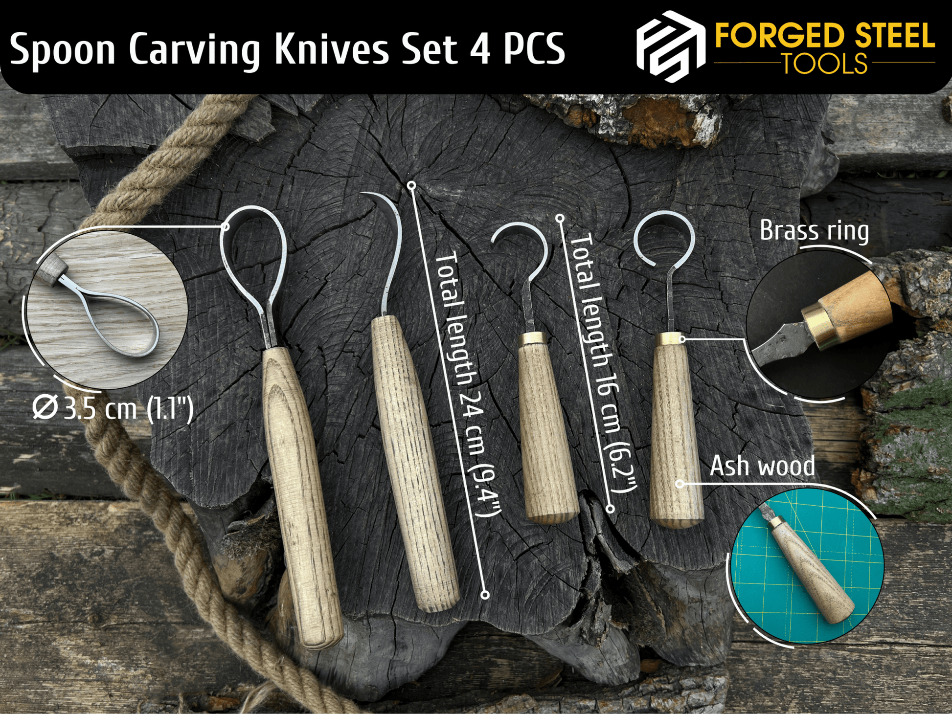 4-Piece Hand-Forged Wood Carving Knife Set is all you need. This well-balanced set of tools is made from hand-forged 52100 carbon steel (ASTM A295) that maintains an edge while cutting smoothly through both hard and soft wood.