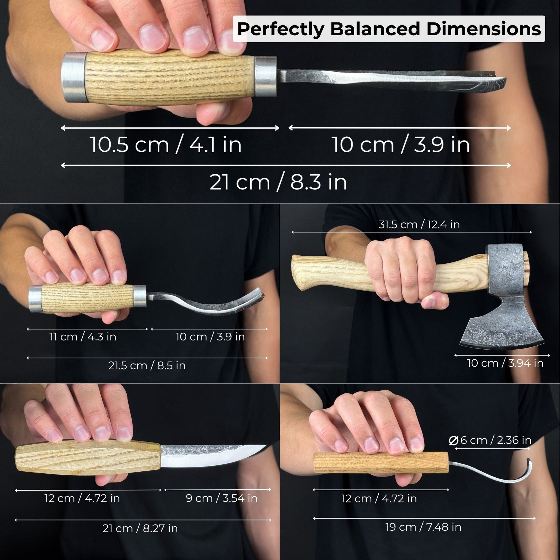 Includes all the essential tools: axe for rough shaping, sloyd knife for precise shaping, hook knife for hollowing, and gouges for carving deep or wide curves.