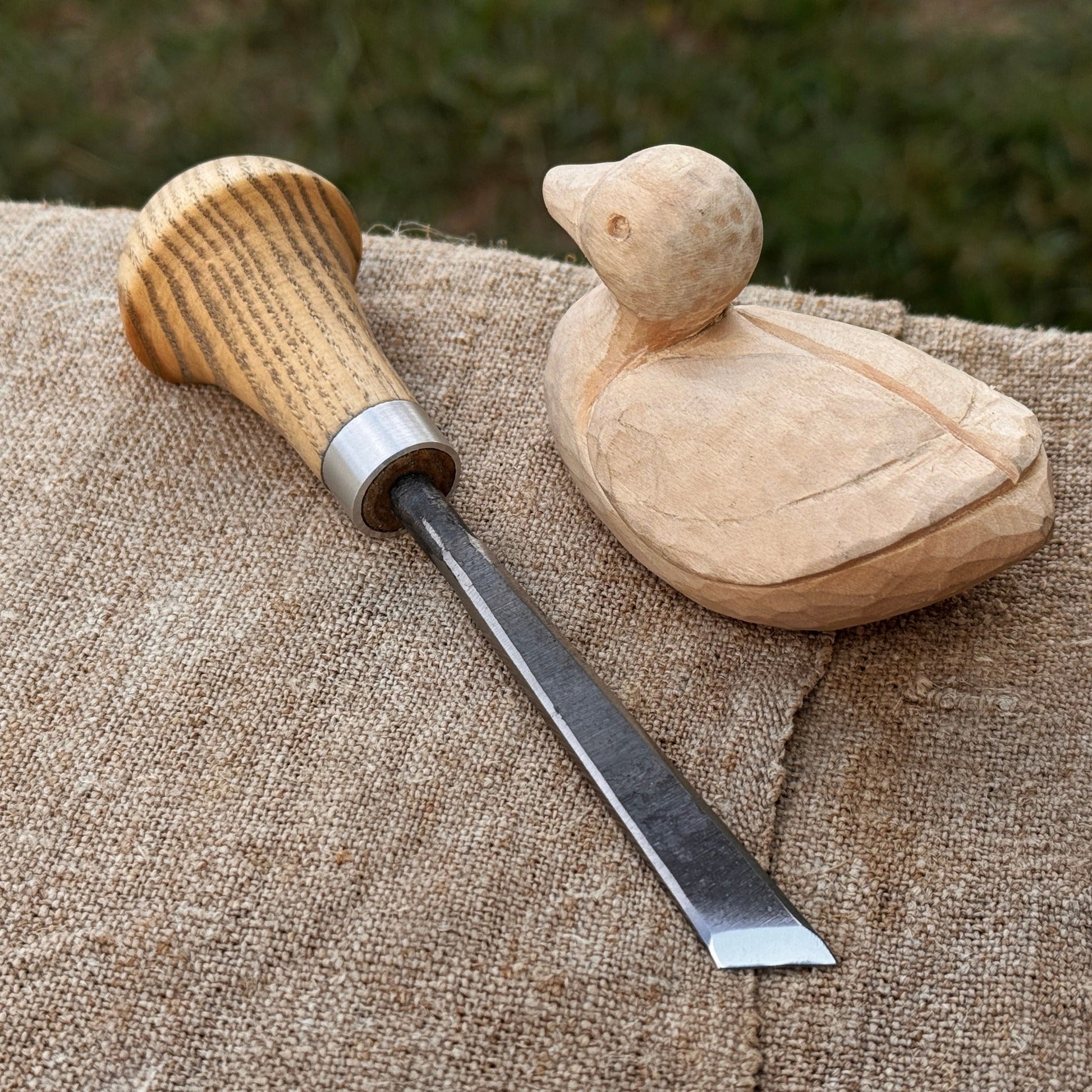 This hand-forged Angled Bevel Carving Chisel with a palm handle is crafted for woodcarvers and detailers who demand high precision and exceptional maneuverability. The angled blade allows access into tight corners, fine joints, and delicate areas where a straight chisel would be too bulky. Perfect for finishing cuts, cleaning up edges, carving intricate designs, or working in confined spaces, this tool offers outstanding control and a superior carving experience.