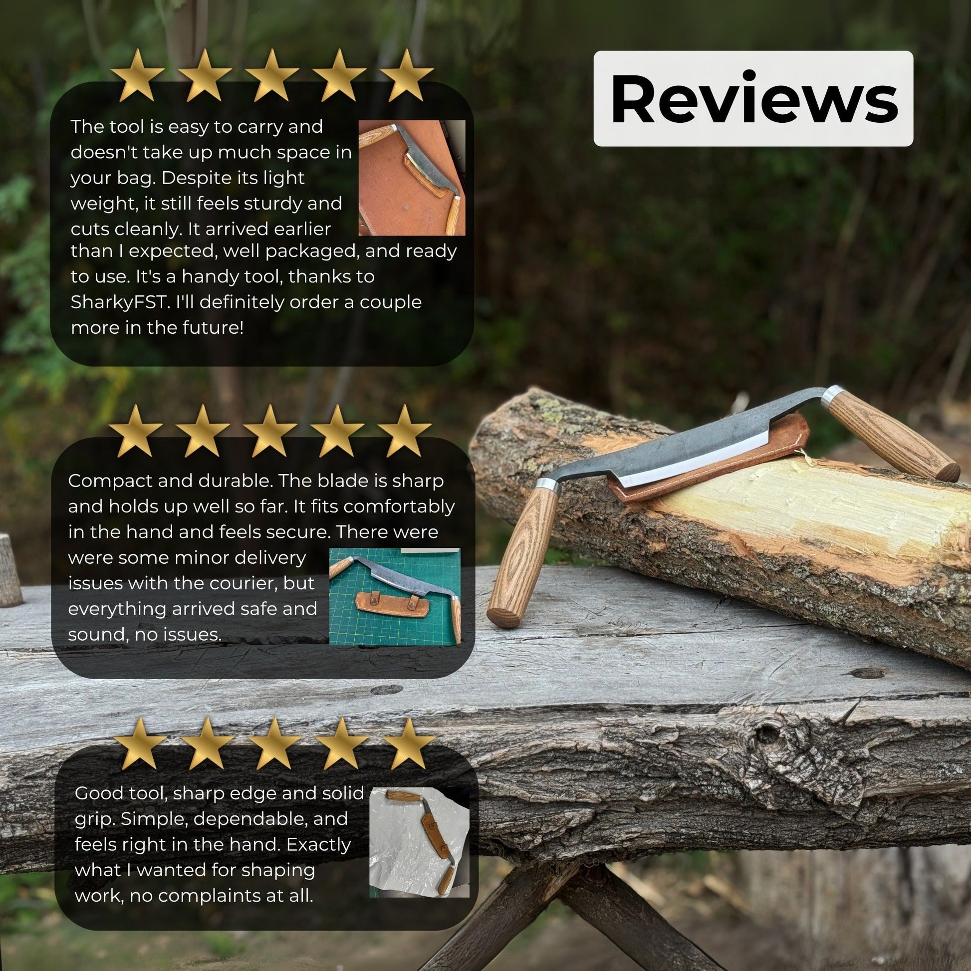 This hand-forged Curved Drawknife (Push/Pull), 14.5 cm (5.7 inches) is designed for woodworkers who need efficient control while shaping, smoothing, and carving large wooden surfaces. Ideal for push or pull strokes, its wide 14.5 cm (5.7 inch) blade excels at hollowing, debarking, and refining curves. Whether you're working on chair legs, spoons, or sculptural forms, this tool delivers the power and precision required for demanding tasks.