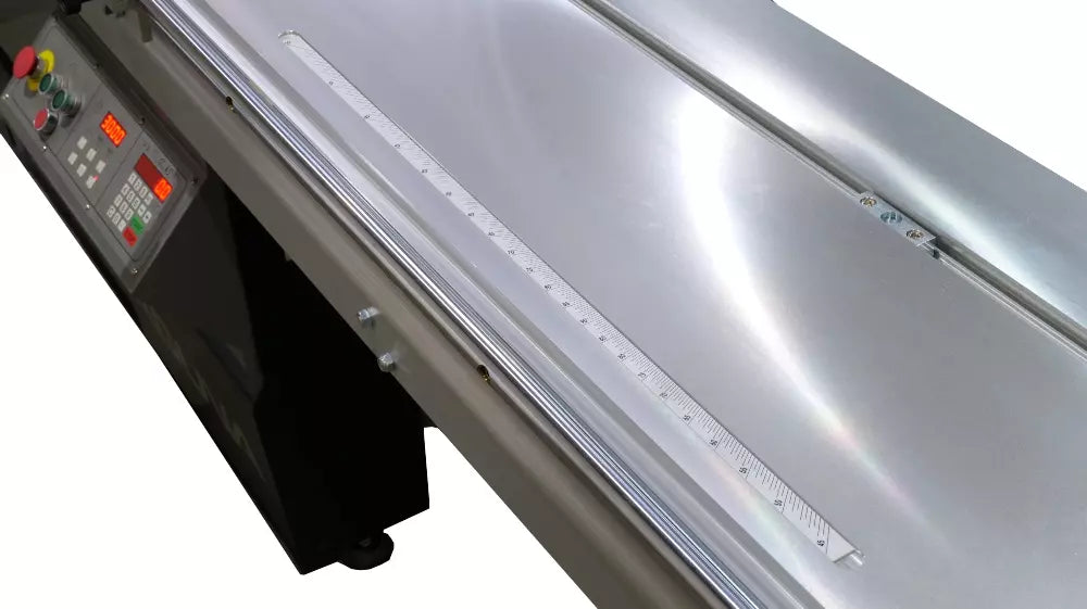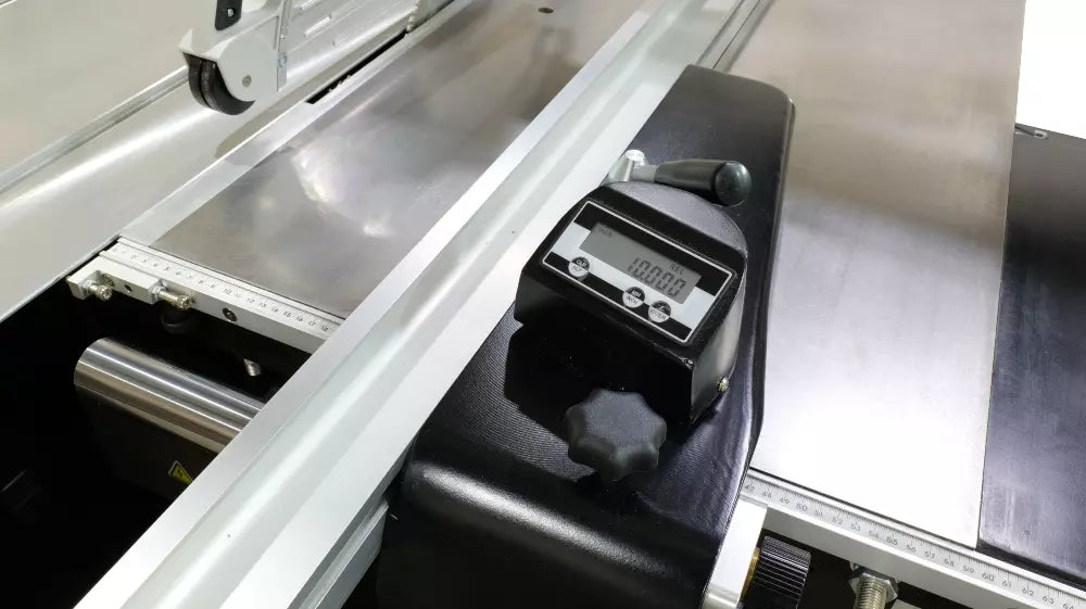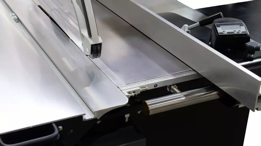 The sliding table is constructed of anodized aluminum. The dumbbell design is widely recognized as the superior choice for high-end sliders today. Ultra-smooth movement allows you to move the table effortlessly. The European-style 51″ rip fence consists of a heavy-duty casting riding on a micro-polished solid steel bar. On the backside of the casting is a small adjustable wheel to make sideways movement a breeze. The rip fence is outfitted with a micro-adjustment for fine-tuning; simply lock it in place and adjust the fence incrementally. The overhead guard comes standard with quick-change 90° and 45° guards; you can switch from one to the other in a matter of seconds. A nice detail is the swing-away function that allows you to quickly move the guard out of the way.