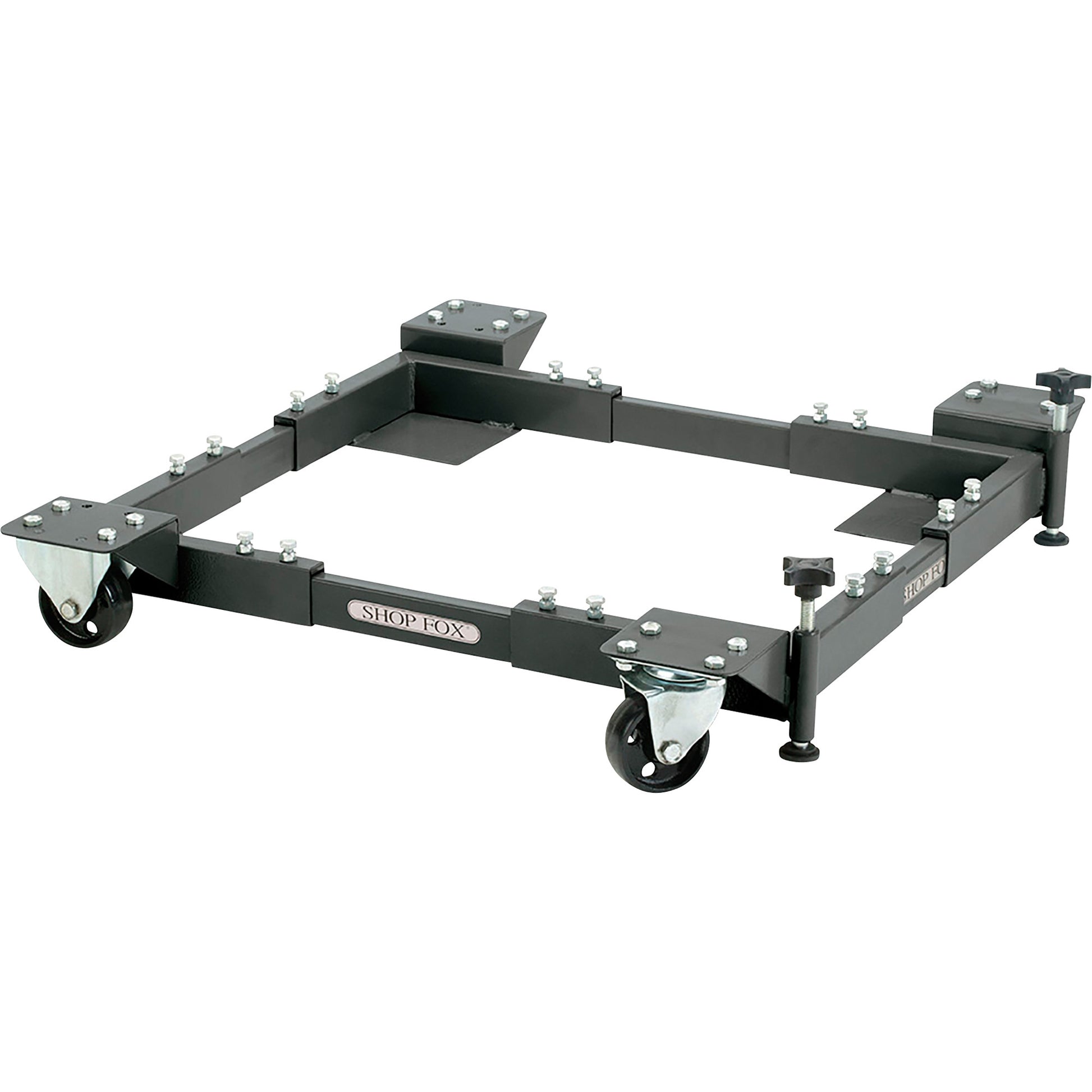 The Shop Fox Super Heavy-Duty Mobile Base has been designed to provide a stable and mobile platform to mount machinery and features built-in adjustment to fit a variety of base sizes. The heavy-duty casters are arranged on outriggers, which allow the machine to sit as low as possible with maximum stability while providing excellent maneuverability. The two-piece rectangular foot pads turn independently from the knob for easy machine leveling and provides a rock solid platform.